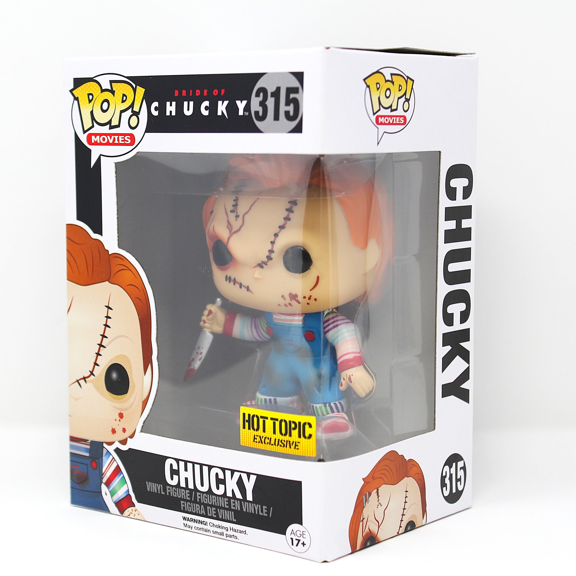 Franchise: Bride of Chucky Character: Chucky Pop #: 315 Variant/Exclusive: Hot Topic Exclusive Display Tip: Display him beside Tiffany or other Chucky-era figures, and keep him at the front of your horror shelf so his face sculpt and outfit details grab attention immediately.