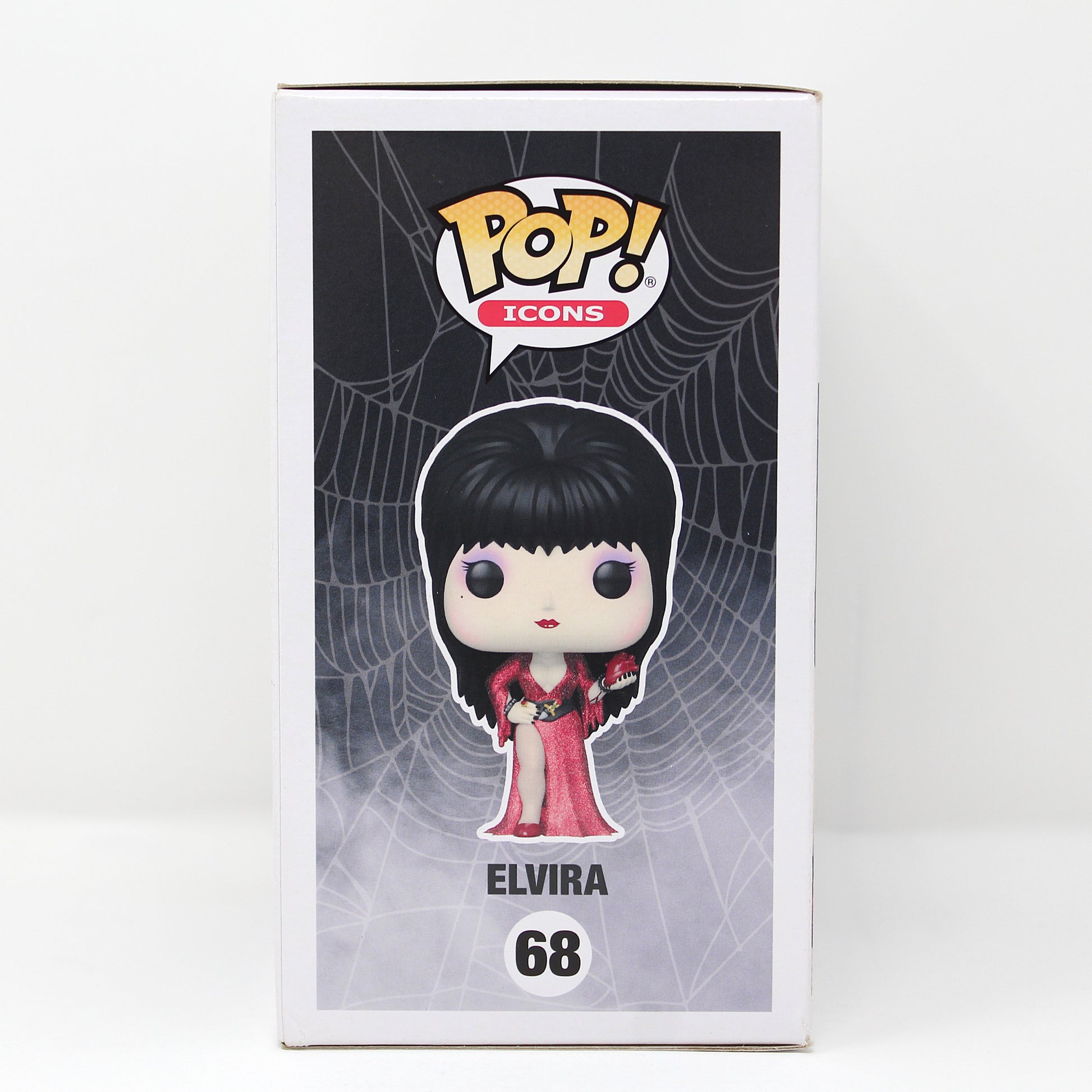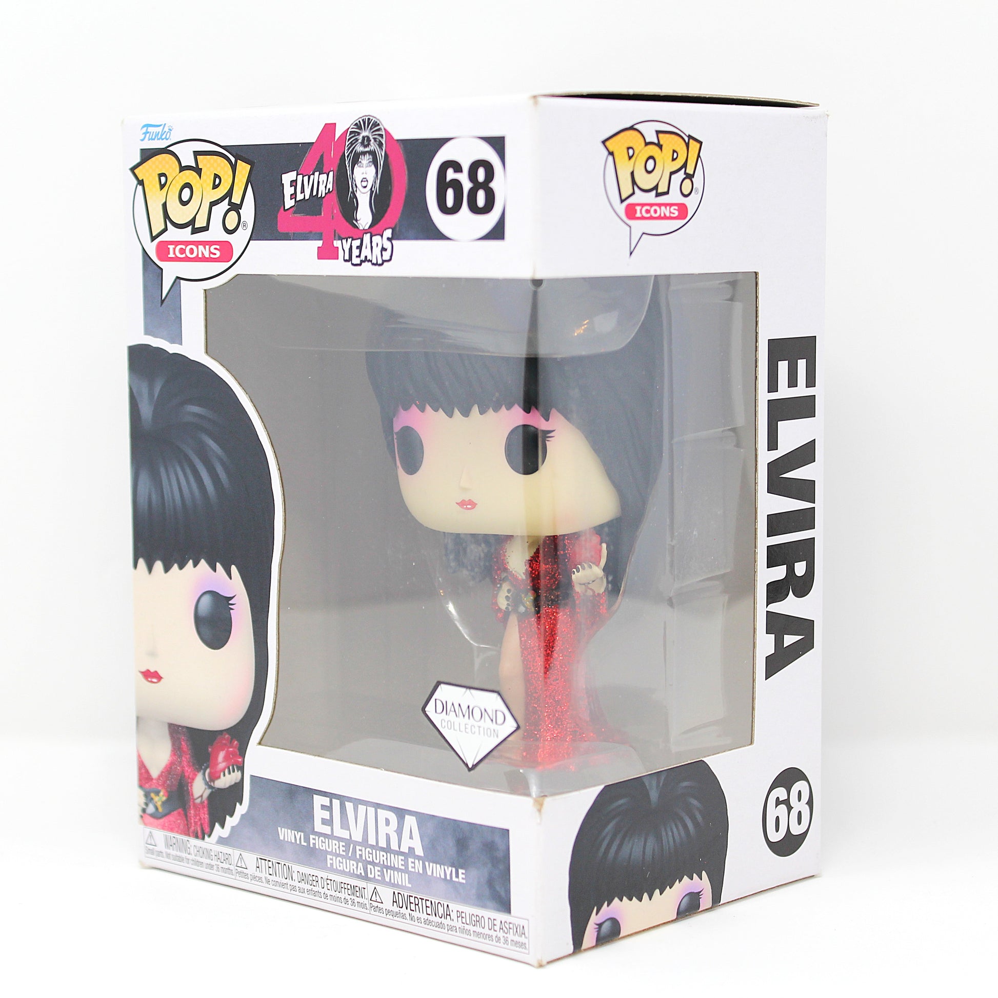 Franchise: Elvira 40 Years Character: Elvira Pop #: 68 Variant/Exclusive: Diamond Collection Display Tip: Display her under shelf lighting or near LED accents so the Diamond finish catches light and enhances the figure’s dramatic silhouette in-box or out-of-box.